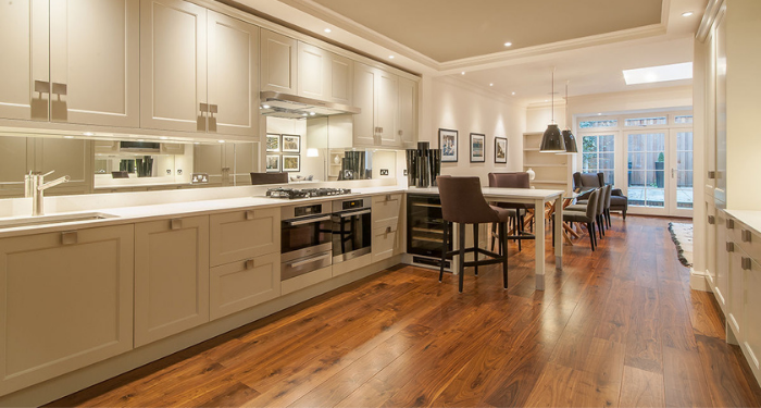 In comparison to other wood flooring options, such as solid wood, engineered wood is the better choice for a kitchen environment. Engineered wood is designed with multiple layers which helps it to withstand changes in moisture and heat in the environment.